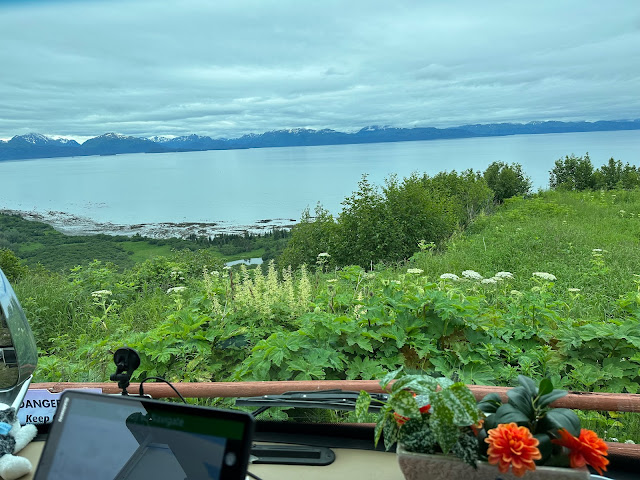 Easy and at times a winding roar to Homer. Arrived and looked at the parking spot reserved for us, on top of a bluff overlooking Kachemak Bay and onto the Gulf of Alaska. Backing in would be an injustice so we just nosed into the edge, ran our power & waste lines under the coach and looked out the windshield to this awesome view.